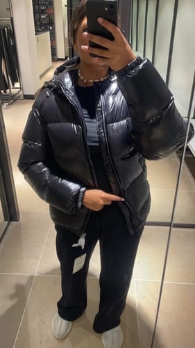 Die Zeitmode™ Glossy Down Jacket besteht aus einer hochwertigen, glänzenden Außenschicht und einer warmen synthetischen Daunenfüllung.